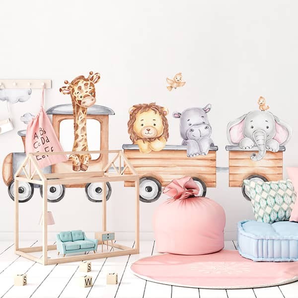 Ejemplo de vinilo infantil con animales viajando en tren.(Fuente: Goodvinilos)
