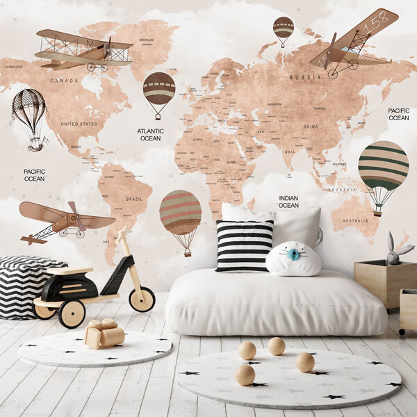 Ejemplo de fotomural juvenil con mapamundi, ideal para facilitar el aprendizaje de geografía.(Fuente: Goodvinilos)Por ello, los fotomurales suelen ser ideales para quienes desean decorar la pared en su totalidad. Los vinilos, sin embargo, son perfectos para quienes buscan dar un toque distintivo sin ocultar completamente el color de la pared, ya que no cubren toda la superficie.Los fotomurales suelen funcionar mejor en habitaciones con un estilo minimalista, donde no compiten con el mobiliario. También son adecuados para decorar el vestíbulo de entrada o para dar protagonismo a una pared específica dentro de una estancia.